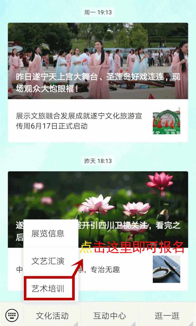 本次培训全部采取网上报名的方式。具体方式用微信搜索公众号“遂宁市文化馆”点击关注,找到报名入口,填写个人信息后确认提交。报名成功后相关信息会以短信方式通知,请注意关注。